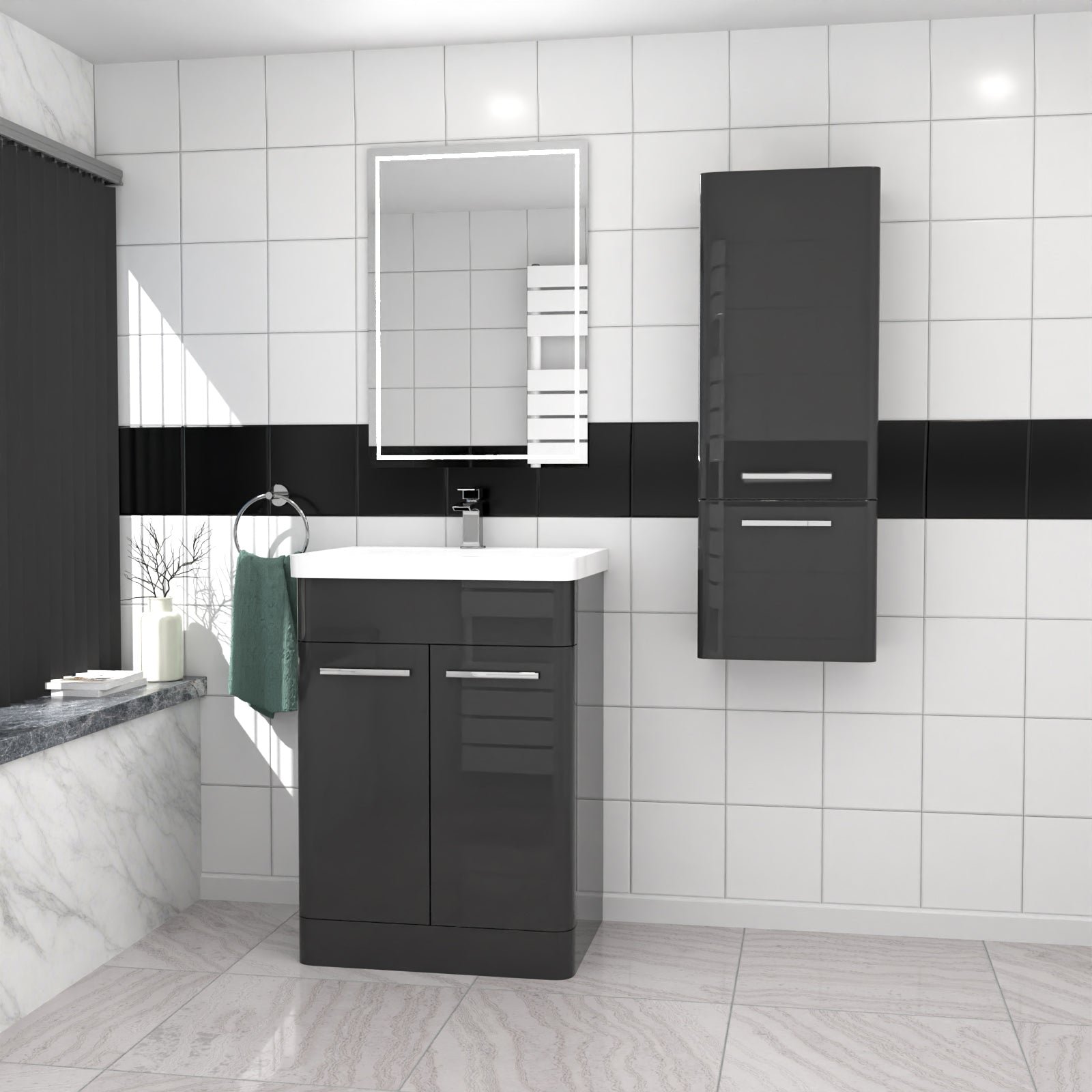Our 600mm Freestanding Dark Grey Basin Vanity & 350mm Wall Hung Tall Cabinet Set offers a stylish storage solution and functionality of daily use. This set has a sleek rounded corner design which can complement a modern look to the bathroom interior. The basin vanity unit and the tall cabinet both come with 2 doors with handles providing ample space for storage. Also the adjustable shelving units in the tall cabinet can keep your bathroom essentials neat and organised. The furniture set is made with high quality MDF material with gloss finish making it an excellent choice for you to upgrade your bathroom interior.