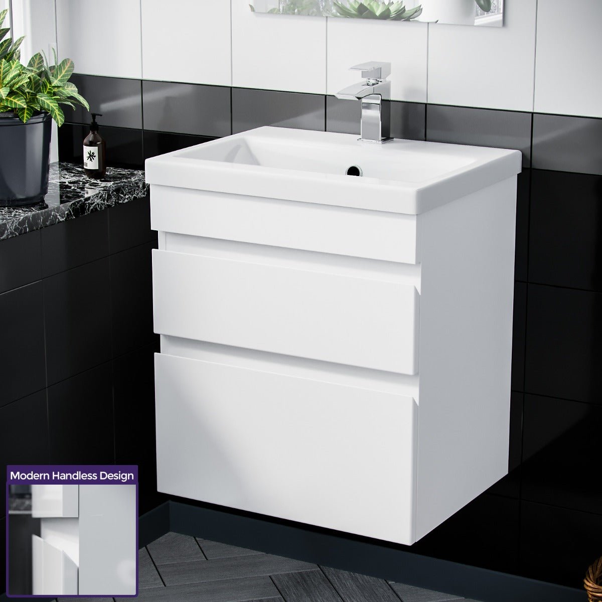 Introducing the Hardie 600mm 2 Drawer Wall Hung Vanity Cabinet and Basin Sink Unit. This stylish and practical bathroom storage solution features a stunning 600 mm white gloss wall-hung basin vanity unit. It comes equipped with a high-quality countertop basin. designed for everyday use. With its durable construction and exquisite gloss finish. our Basin Vanity Unit offers the perfect blend of functionality and elegance. Upgrade your bathroom with this beautiful and reliable addition.