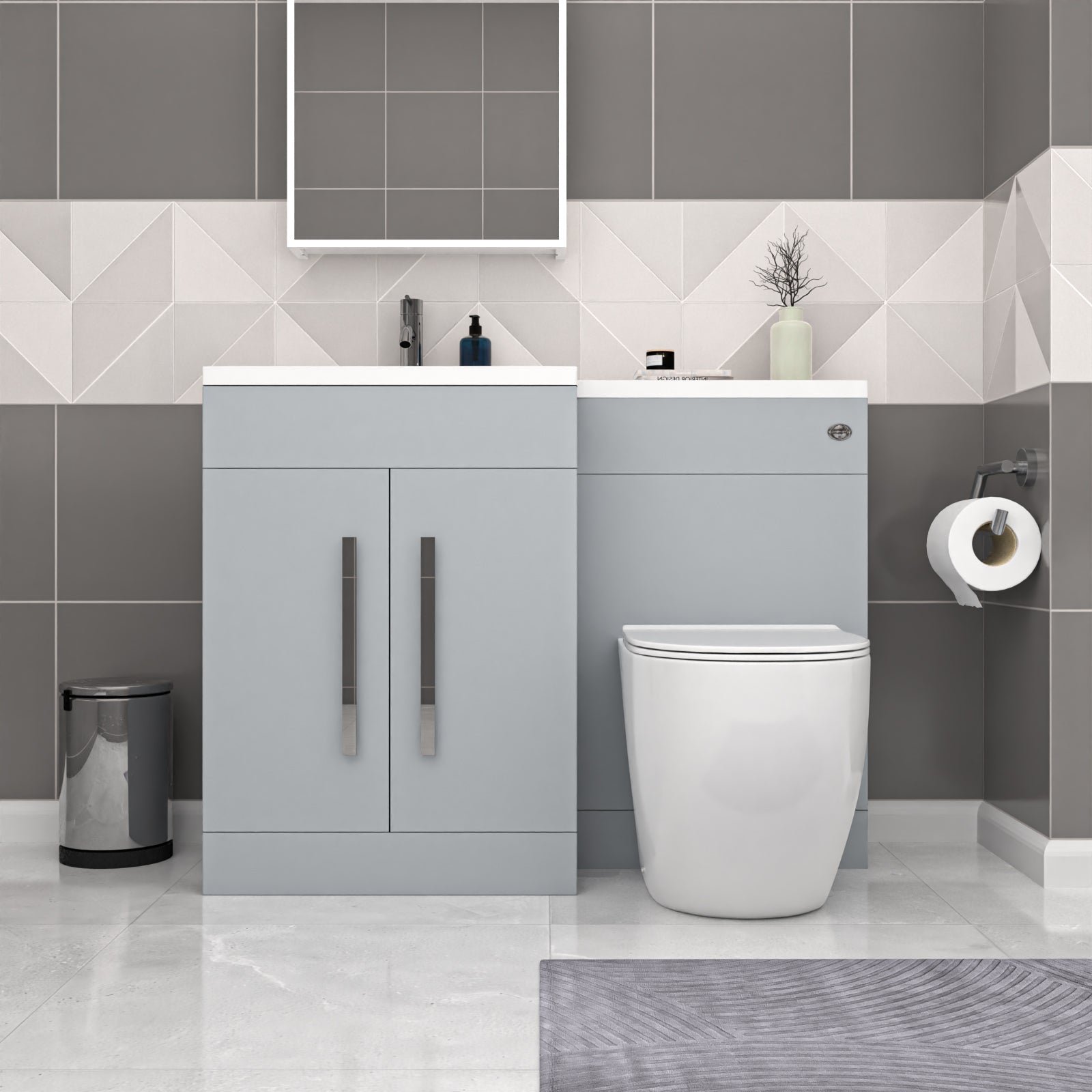 It features a white resin basin top. with a two door water resistant MDF cabinet and WC unit and contemporary chrome effect handles. bringing a modern look to your bathroom.