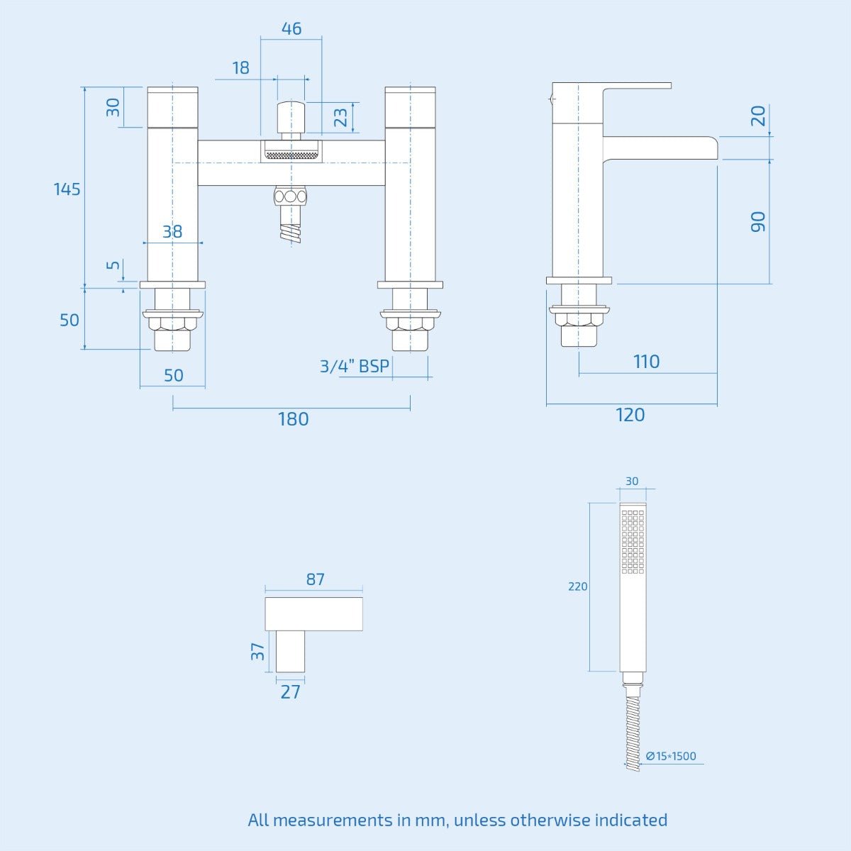 - Tap mounting – End of bath (above overflow)