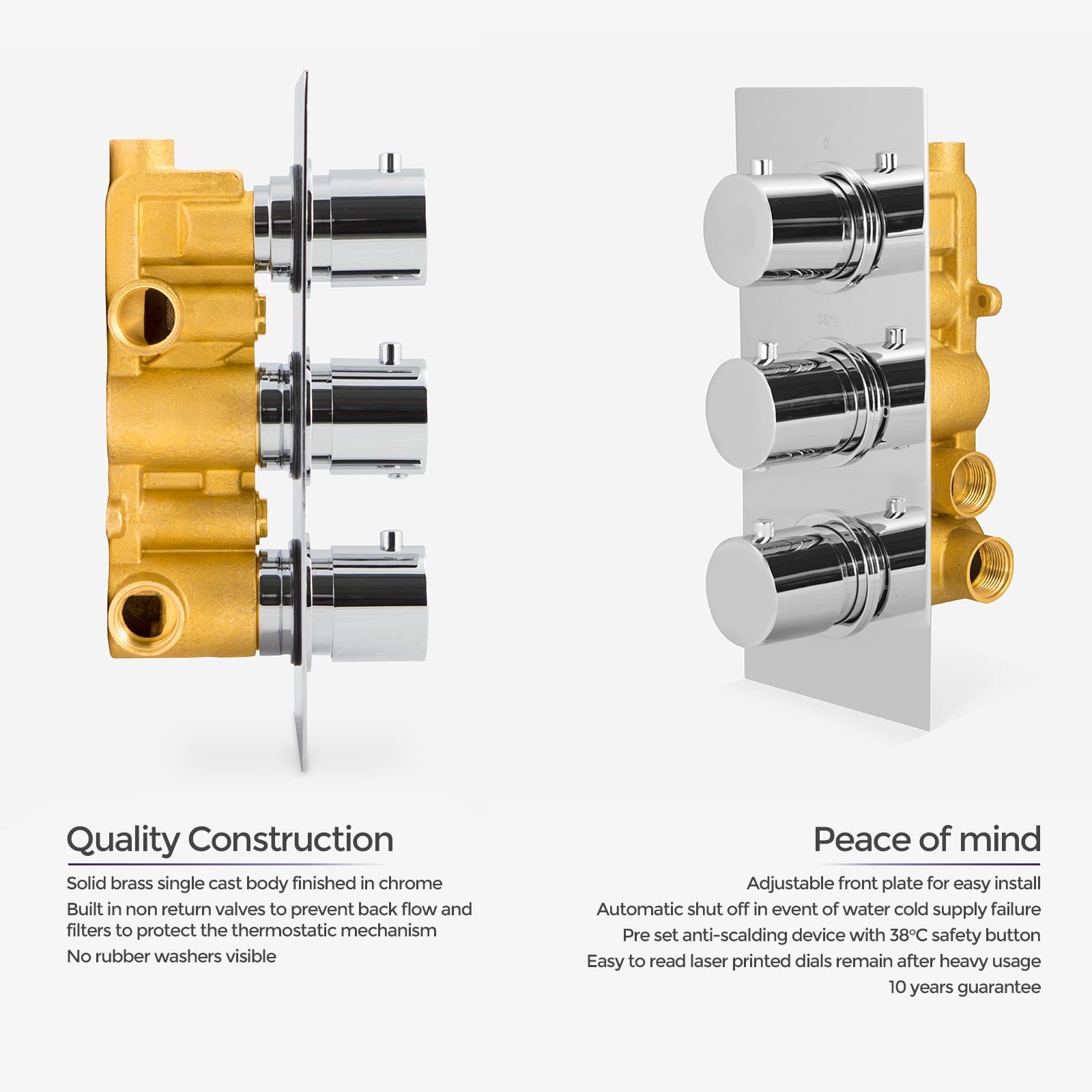 Constructed from solid brass. with modern ceramic disc technology. our stylish concealed thermostatic shower mixer valve is perfect for creating a new minimalistic look to your bathroom. The Thermostatic mixer valve mounts onto the wall making your shower look less cluttered and bulky and the slim rectangular backplate neatly conceals all pipework. adding an exceptional sleek finish.
