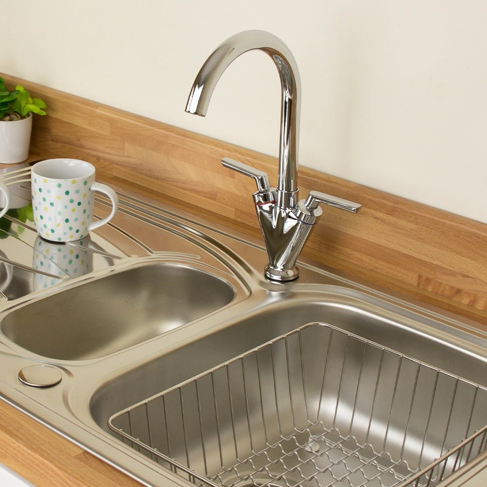 This Contemporary Swivel Spout Mono Mixer Kitchen Tap is a sleek. contemporary chrome kitchen sink mixer tap. Featuring dual handles with a highly reflective chrome finish. these taps add a new modern touch to any kitchen. The taps are easy to use and perfect for anyone who wants an easy-to-use and stylish addition to their kitchen.