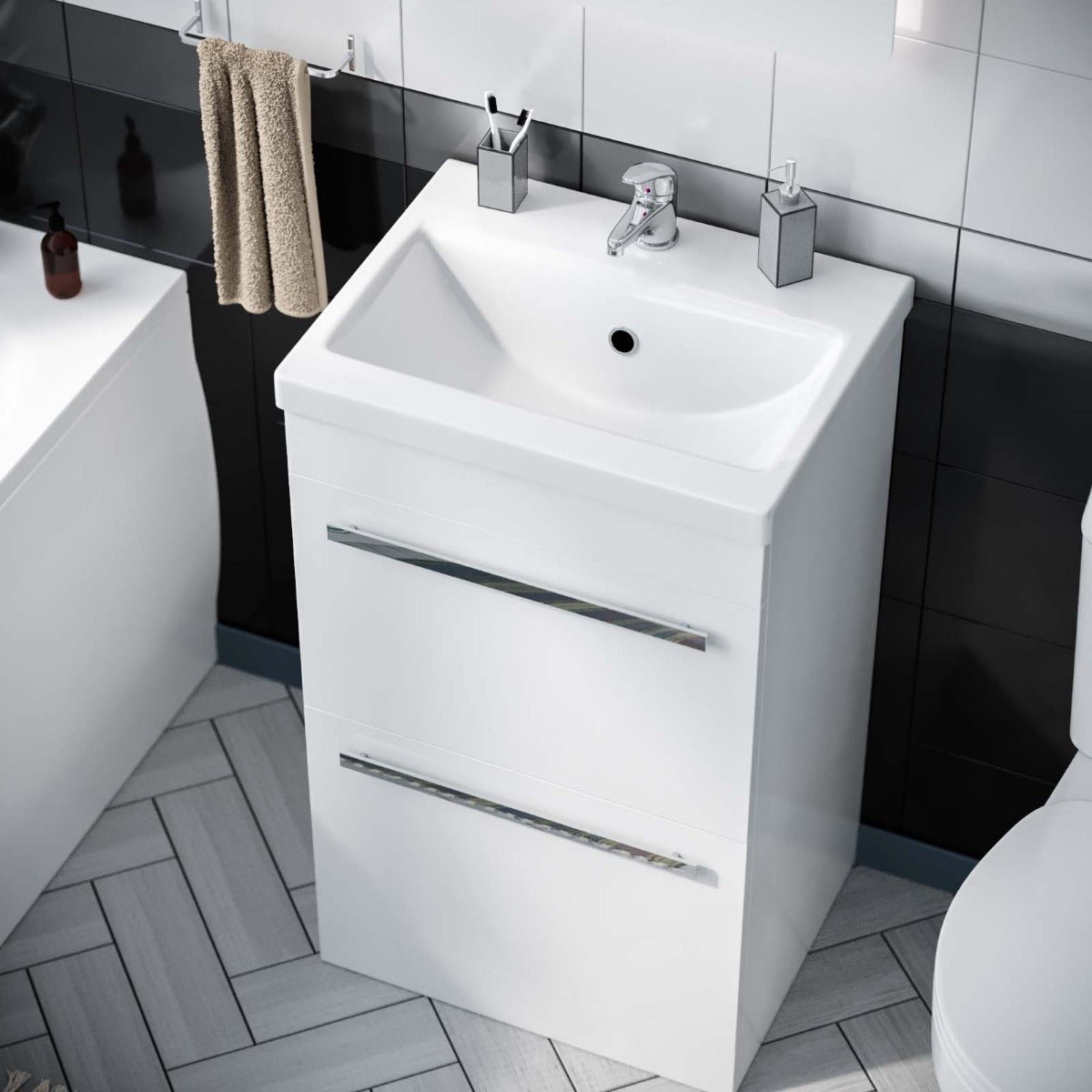 Our 510mm Floor Standing 2 Drawer Vanity Unit Cabinets bathroom storage units are ideal for family bathrooms and add a touch of style to a practical space. The units feature runners and are delivered fully assembled to make fitting easy and efficient. This range features a high-quality finish. which is perfect for modern bathrooms.