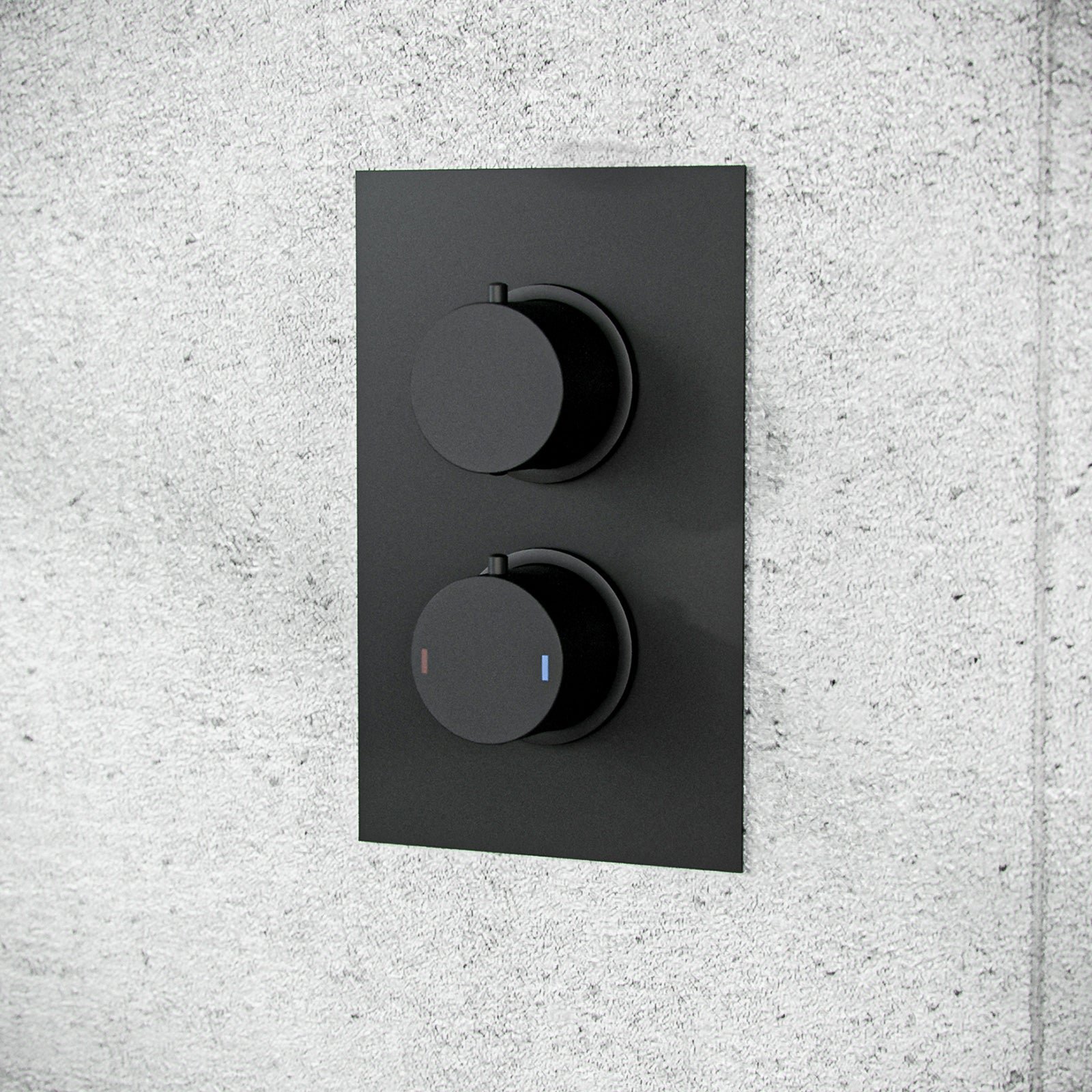 This stunning matt black slim round concealed thermostatic mixer valve shower set is a perfect addition to any modern designer bathroom. The concealed shower valve has two easy controls. for temperature and flow. The valve body comes with a contemporary square face plate.